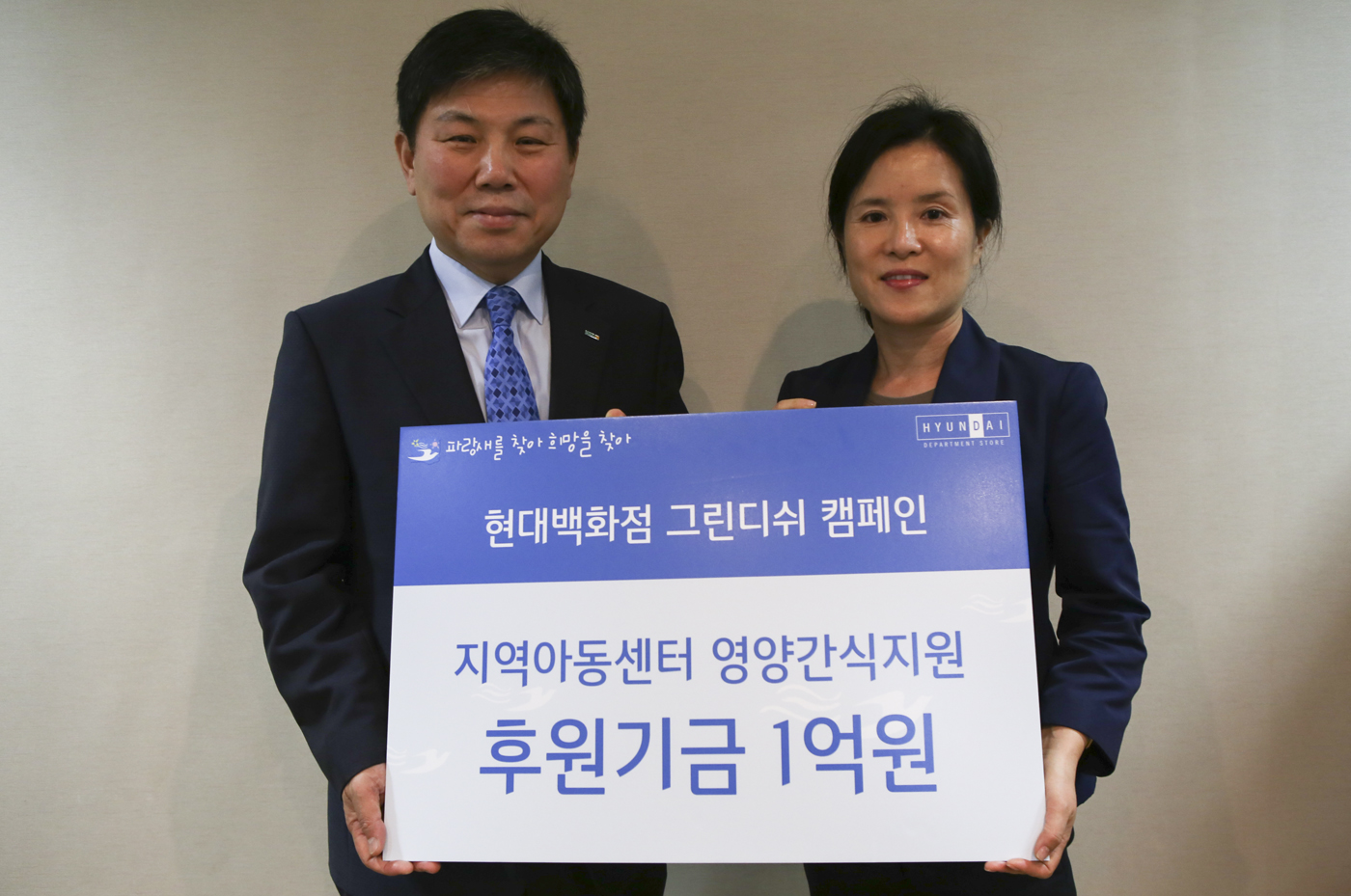 현대백화점 하병호 대표<사진 왼쪽>는 15일 백화점 식당가, 직원식당에서 나오는 음식물 쓰레기를 줄이는 그린디쉬 캠페인을 통해 모아진 기금 1억원을 세이브더칠드런에 소외아동을 위한 영양간식비로 전달했다.