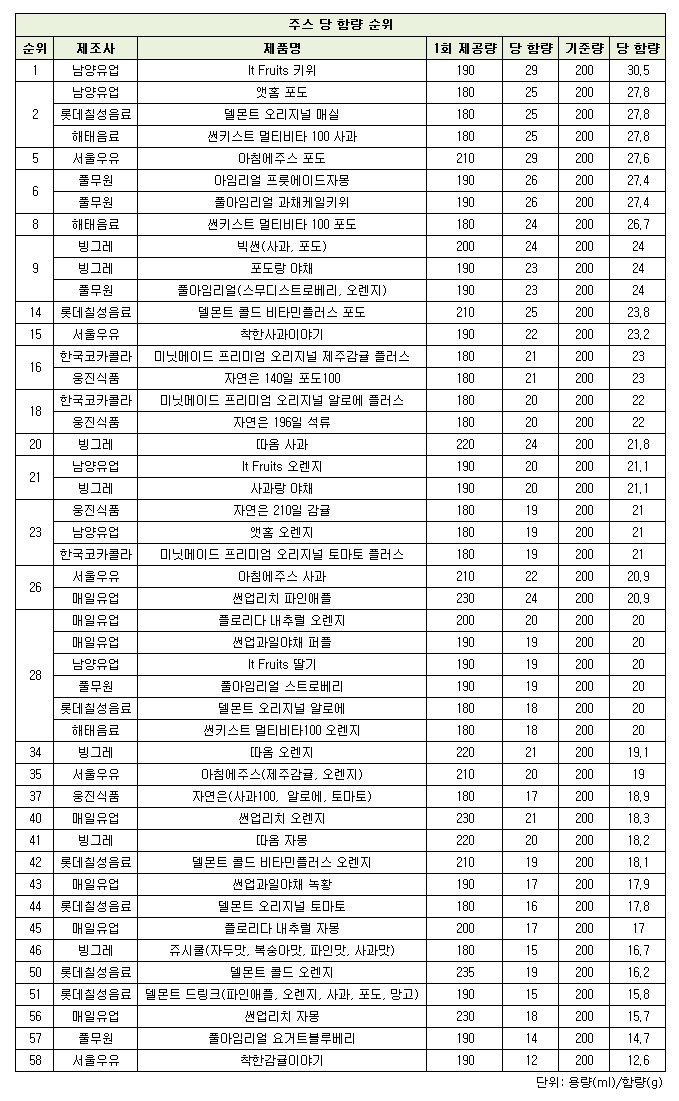 이중 콜라(21.9g)보다도 당함량이 높은 제품도 남양유업 ‘It Fruits 키위’를 비롯해 ‘앳홈 포도’, 롯데칠성음료 ‘델몬트 오리지널 매실’, ‘델몬트 콜드 비타민플러스 포도’, 해태음료 ‘썬키스트 멀티비타 100(사과, 포도)’, 서울우유 ‘아침에주스 포도’, ‘착한사과이야기’, 풀무원 ‘아임리얼 프룻에이드자몽’, ‘풀아임리얼 과채케일키위’, ‘풀아임리얼(스무디스트로베리, 오렌지)’, 빙그레 ‘빅썬(사과, 포도)’, ‘포도랑 야채’, 한국코카콜라 ‘미닛메이드 프리미엄 오리지널 플러스(제주감귤, 알로에)’, 웅진식품 ‘자연은 140일 포도 100’, ‘자연은 196일 석류’ 등 전체의 3분의 1가량인 무려 19개에 이른다.