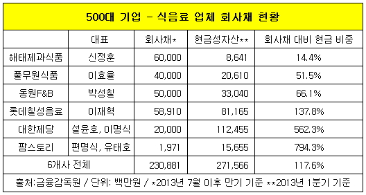 만기가 도래하는 회사채를 상환하는 데 약간의 여유가 있는 수준이다. 그러나 업체별 상황은 판이했다. 롯데칠성음료와 대한제당, 팜스토리는 현금성 자산으로 만기 회사채를 상환하고도 남는 반면, 해태제과식품과 풀무원식품, 동원F&B는 현금성 자산이 만기 회사채 보다 크게 적었다.