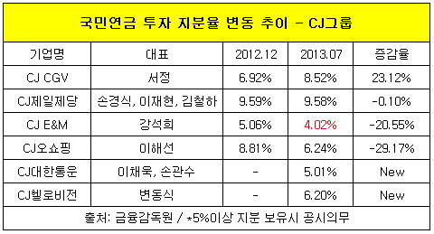 CJ대한통운(대표 이채욱, 손관수)과 CJ헬로비전(대표 변동식)은 지분율 각각 5.01%, 6.2%로 국민연금의 '5% 클럽'에 새로 진입했다.