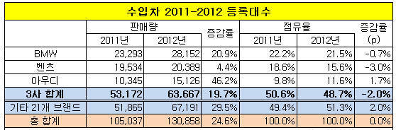 독일 자동차 3총사가 국내 수입차 시장을 주도하며 판매를 크게 늘려나가는 한편 파이낸셜 사업을 통해 더 큰 돈을 벌어가고 있는 셈이다. 3사는 지난해 국내 수입차 시장의 절반 이상을 차지할 정도로 압도적인 우위를 보이고 있다.