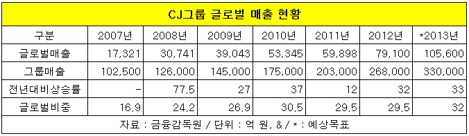 CJ는 올해 해외에서만 10조5천600억 원의 매출을 올려 그룹 전체 매출의 32%를 달성한다는 목표를 세우고 있다. 지난해보다 33%나 늘어난 금액이다.