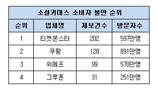 23일 소비자가 만드는 신문이 2013년 상반기 소비자고발센터 등에 접수된 소셜커머스 이용 소비자 불만 제보를 조사한 결과 티몬이 202건으로 1위를 차지했다. 쿠팡이 128건으로 2위를 차지했고 위메프와 그루폰이 각각 99건, 31건으로 뒤를 이었다.