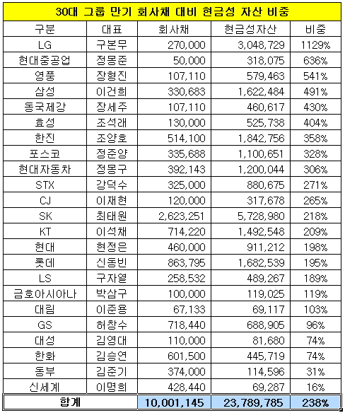이들 61개사가 보유하고 있는 현금 및 현금성 자산은 23조7천897억8천500만 원으로 만기 회사채의 2.3배로 조사됐다. 만기 회사채를 전부 상환하고도 13조 원이 넘는 돈이 남는 것으로 계산됐다.