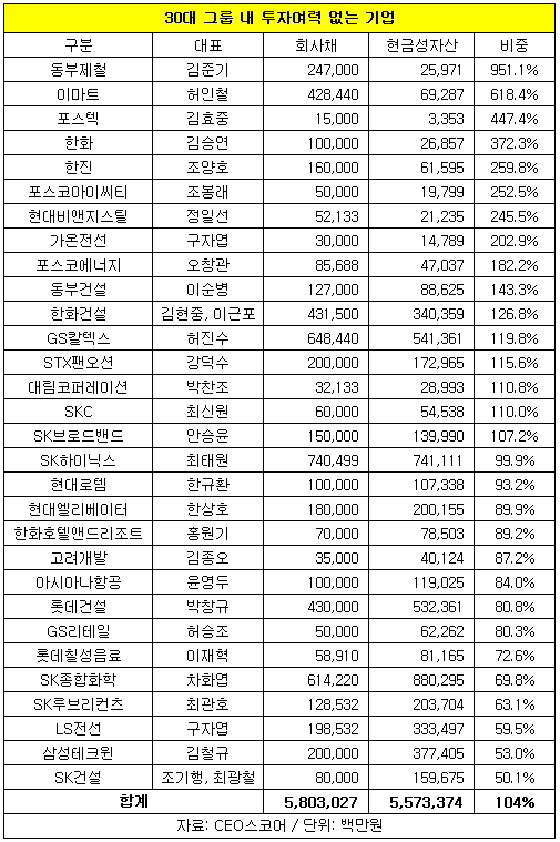 또 포스코에너지(대표 오창관)가 1.8배, 동부건설(대표 이순병)이 1.4배, 한화건설이 1.2배, GS칼텍스(대표 허진수)와 STX팬오션(대표 강덕수), 대림코퍼레이션(대표 박찬조), SKC(대표 최신원)가 1.1배, SK브로드밴드(대표 안승윤)가 1배의 비율을 보였다. 이들 기업은 보유중인 현금성 자산으로 회사채를 상환하기도 어려운 상황이다.
