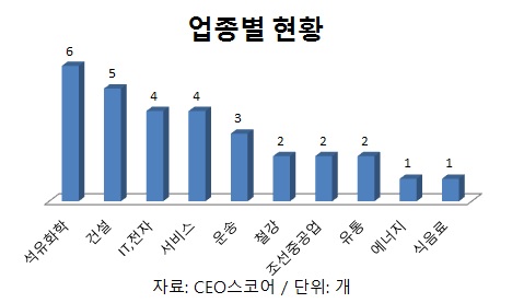 삼성(회장 이건희)과 현대(회장 현정은), 금호아시아나(회장 윤영두), 신세계(회장 이명희), 한진(회장 조양호)은 1개씩이었다. 업종별로는 석유·화학이 6개로 가장 많았고, 건설이 5개, 전자 및 IT와 서비스가 4개씩, 운송이 3개, 철강·조선중공업·유동 2개, 에너지와 식음료 기업이 1곳씩 포함됐다.