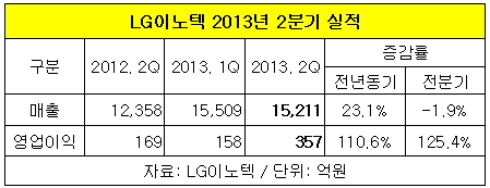 LG이노텍은 올 2분기 1조5천억 원의 매출과 함께 357억 원의 영업이익을 거뒀다고 24일 발표했다.