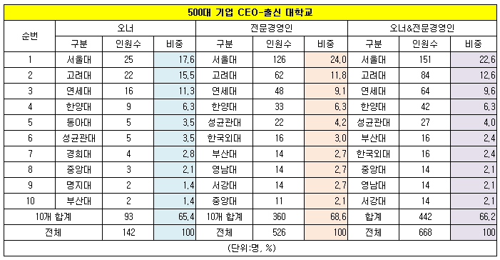 500대 기업 CEO 가운데 오너 경영인 142명만 따질 경우 서울대 출신이 25명으로 제일 많고 고려대가 22명, 연세대가 16명을 기록했다. 이른바 SKY출신이 44.4%를 차지하고 있다. 한양대를 포함한 상위 4개 대학의 비중은 50.7%로 집계됐다.