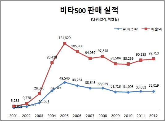 이 같은 공격적인 마케팅에 힘입어 지난해 '비타500'은 전체매출의 27%에 해당하는 926억 원의 매출을 달성하는 등 2003년부터는 꾸준히 연간 3억병 이상씩 팔리고 있다.