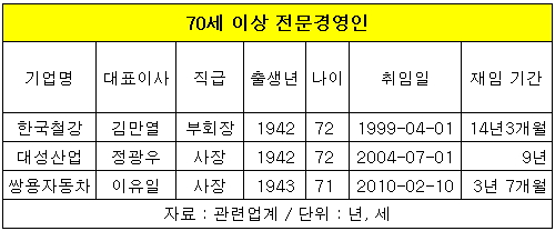 26일 관련업계에 따르면 국내 500대 기업의 현직 전문경영인 526명 가운데 70세 이상(공기업 제외)은 김만열 한국철강 부회장과 대성산업 정광우 사장, 이유일 쌍용자동차 사장 뿐인 것으로 조사됐다.