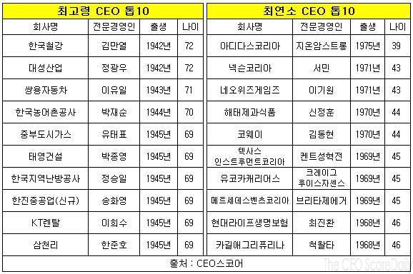 26일 재벌 및 CEO 기업 경영성과 평가사이트인 CEO스코어(대표 박주근)에 따르면 500대 기업 전문경영인 가운데 최고령자는 1942년생인 김만열 한국철강 부회장과 정광우 대성산업 사장, 최연소자는 1975년 생인 지온 암스트롱 아디다스 코리아 사장이다.