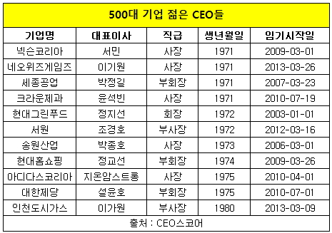 또 정교선 현대홈쇼핑 부회장이 74년생, 대한제당의 설윤효 부회장과 아디다스코리아의 지온 암스트롱 사장은 75년생, 그리고 인천도시가스 이가원 부사장이 1980년생으로 500대 기업 CEO 중 가장 어리다.