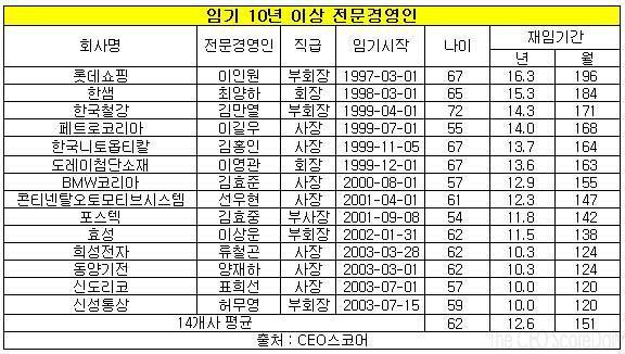 26일 재벌 및 CEO 기업 경영성과 평가사이트인 CEO스코어(대표 박주근)에 따르면 7월 현재 500대 기업의 전문경영인 526명 가운데 재임기간이 10년 이상인 사람은 14명으로, 전체의 2.7%를 차지하고 있는 것으로 집계됐다. 이들의 평균 재임기간은 12년 7개월이며, 평균 나이는 62세로 나타났다.