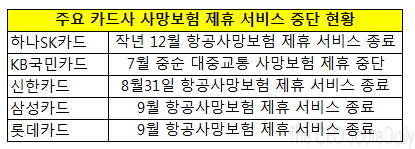 [소비자가만드는신문=김문수 기자] 카드업계에서 항공 사망 보험 서비스를 비롯한 각종 사망보험 관련 제휴 서비스가 잇달아 축소되고 있다.