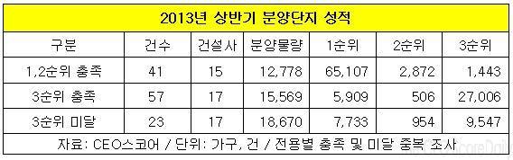 3순위 청약자의 가세에 힘입어 올 상반기 아파트 청약 경쟁률은 평균 2.58대 1을 기록했지만 22개 건설사 가운데 현대산업개발을 비롯한 5개사는 청약자수가 분양물량을 밑돌았다.