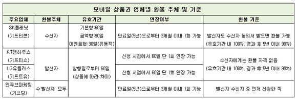 기프티콘은 환불 주체가 수신자인 반면 기프티쇼와 기프트유는 발신자, 기프팅은 수·발신자 모두 가능하도록 규정하고 있다. 이처럼 환불 주체가 제각각이다보니 소비자들이 각 회사의 규정을 개별적으로 알기 어렵고, 특히 발신자에게 환불 권리가 있는 기프티쇼와 기프트유는 상대방이 상품권을 사용했는지조차 알 수 없어 돈을 날리기 일쑤다.