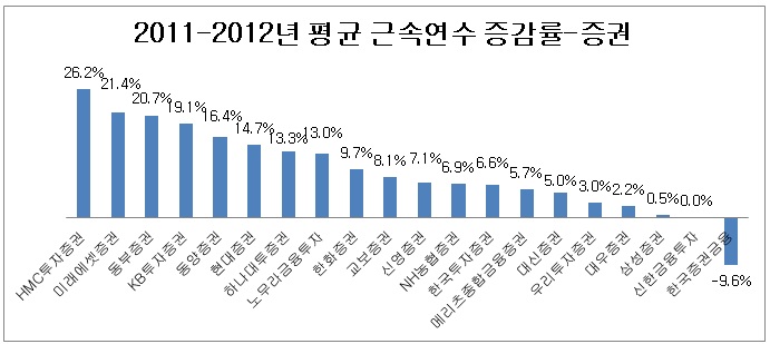지난해 평균 근속연수가 가장 많이 늘어난 곳은 HMC투자증권으로 26% 증가했고 미래에셋증권이 21%, 동부증권은 20%, KB투자증권 19%, 동양증권은 16% 늘었다. 또 현대증권은 14%, 하나대투증권과 노무라금융투자는 13% 가량 증가했다.