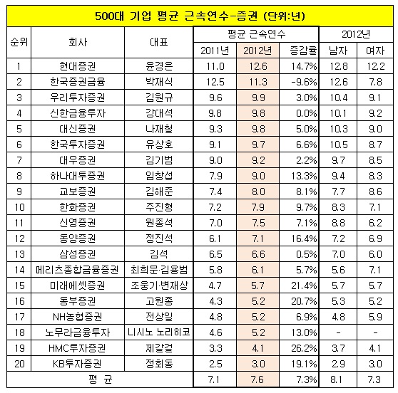 1일 금융감독원에 따르면 국내 500대 기업 가운데 관련 정보를 공개한 20개 증권사의 직원 근속연수는 지난해(2012 회계년도) 기준 7.6년으로 전년보다 7.3% 길어졌다.