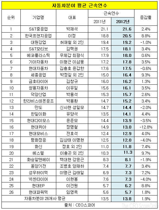 1일 재벌 및 CEO 기업 경영성과 평가사이트인 CEO스코어(대표 박주근)에 따르면 국내 500대 기업 가운데 관련 정보를 공개한 자동차업종 26개 기업의 직원 평균 근속 연수는 지난해 기준 13.8년으로 집계됐다.