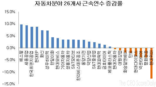 한편 26개 기업 중 70%에 달하는 18곳은 지난해 근속 연수가 늘어난 것으로 나타났다. 에스엘이 9.7%로 가장 높은 증가율을 기록했고 세종공업이 9.3%, 한국프랜지공업과 현대EP가 8.8% 늘었다. 이에 비해 현대위아는 근속연수가 12.8% 감소해 그 폭이 가장 컸다. 또 넥센타이어, 평화정공은 4%, 현대다이모스는 3.5%, 만도는 2% 줄었다.