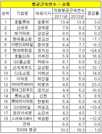 이에 비해 식자재유통회사인 CJ프레시웨이(대표 박승환)는 3.9년으로 근속연수가 가장 짧았으며, 편의점업체인 코리아세븐(대표 소진세)과 GS리테일(대표 허승조)은 4.5년에 불과했다.