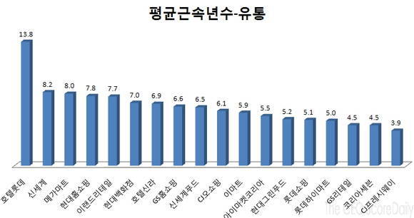 [소비자가만드는신문=이경주 기자]유통업체 직원들의 평균 근속연수가 500대 기업 평균치에 크게 못 미치는 것으로 나타났다. 여성직원의 근속연수가 5년을 겨우 넘길 정도로 짧기 때운이다.