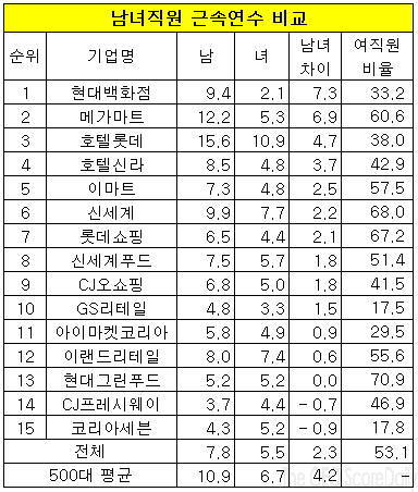유통업체 남성 직원의 평균 근속연수는 7.8년, 여성 직원은 5.5년으로 2.3년의 차이를 보였다. 500대 기업 전체의 남녀 격차가 4.2년인 것에 비하면 유통업계에서는 그 차이가 크게 좁혀진 셈이다.