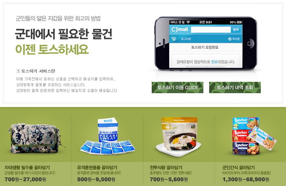 ‘토스하기’ 서비스란 원하는 상품을 고른 후 특정 대상에게 결제를 요청하는 서비스로 CJ몰의 군용품 전문관인 ‘아르미 오 샵(Army O Shop)’에서 상품을 고른 후 결제할 상대방을 지정하면 상대방의 휴대전화로 결제 정보가 전송돼 결제가 가능한 서비스이다.