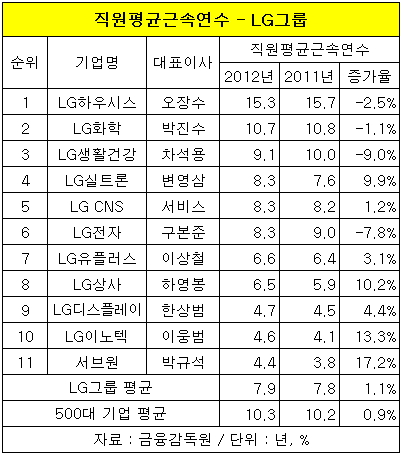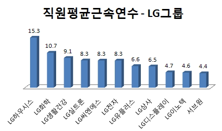 제조업체인 LG하우시스와 LG화학을 제외하고 모두 근속연수가 500대 기업 평균치에 미달했다.