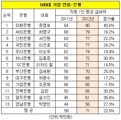 연봉이 가장 후한 곳은 외환은행(행장 윤용로)으로 1인 평균 9천만 원이 지급됐다. 연봉이 가장 짠 경남은행(행장 박영빈)에 비해 3천400만 원이나 높은 금액이다.