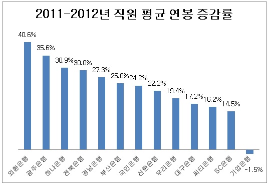 지난해 직원 연봉이 가장 많이 오른 곳은 1위인 외환은행으로 전년보다 40%나 증가했다.