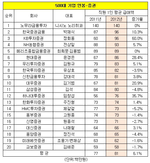 가장 연봉이 두둑한 노무라금융투자(대표 니시노 노리히코)는 평균 연봉이 1천4천만 원에 달한 반면, 꼴찌인 교보증권(대표 김해준)은 500대 기업 평균치를 밑돌았다.