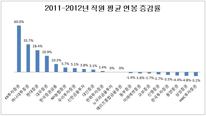 연봉이 가장 많이 오른 곳은 KB투자증권으로 6천만 원에서 9천600만 원으로 무려 60%나 증가했다. 이에 따라 연봉 순위도 18위에서 3위로 껑충 뛰었다.