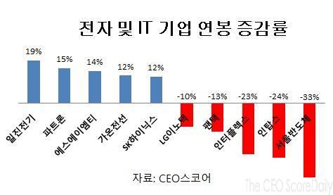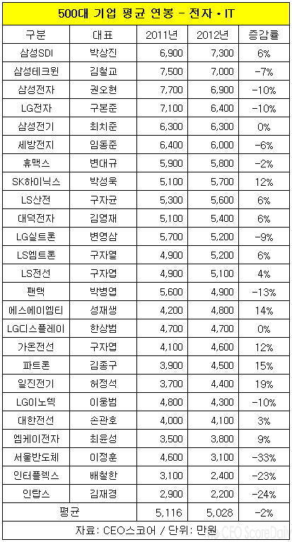 이밖에 인탑스가 24%, 인터플렉스가 23%, 팬택(대표 박병엽)이 13% 감소했다. 삼성전자와 LG전자, LG이노텍(대표 이웅범), LG실트론(대표 변영삼)은 평균 연봉이 10%가량 줄었다.