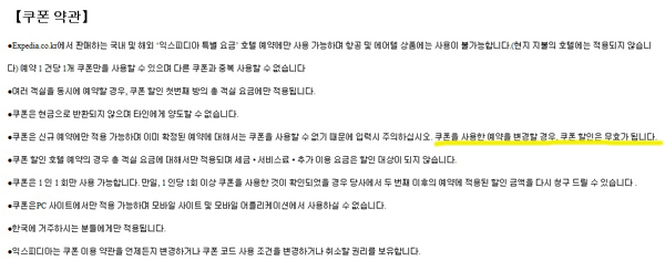 현재 익스피디아 홈페이지에 게시된 ‘쿠폰 약관’에는 ‘쿠폰을 사용한 예약을 변경할 경우 쿠폰 할인은 무효가 됩니다’라고만 두루뭉술하게 안내하고 있다.