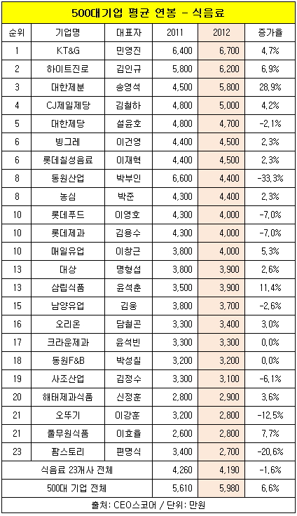 또 최근 갑을논란에 중심에 있었던 남양유업(대표 김웅)을 비롯해 오리온(대표 담철곤), 크라운제과(대표 윤석빈), 동원F&B(대표 박성칠), 사조산업(대표 김정수)이 3천만 원대 연봉으로 15~19위를 차지했다.
