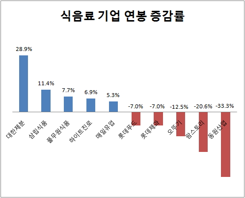 연봉이 가장 많이 늘어난 대한제분은 전년도 대비 영업이익이 598%나 증가했고, 삼립식품은 67%, 풀무원식품은 7.8%늘어났다.