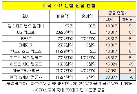 미국의 경우 웰스파고 앤 컴퍼니와 US 뱅코프, BB&T, 코메리카, 선트러스트 뱅크스, 피프스 서브 뱅코프의 연봉 평균은 5천100만 원, 허드슨 시티 뱅코프는 4천900만 원이었다.