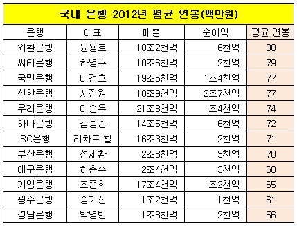또 대구은행(행장 하춘수)과 기업은행(행장 조준희), 광주은행(행장 송기진)은 평균 연봉이 6천만 원대였고 최하위인 경남은행(행장 박영빈)도 미국 7개 은행 평균치보다 500만 원이나 많았다.