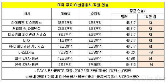 미국의 경우 아메리칸 익스프레스를 비롯한 5개사의 직원 연봉 평균이 5천100만 원, 마스터카드가 4천900만 원인 데 비해 KB국민카드를 비롯한 국내 6개사의 직원 연봉 평균은 6천400만 원이었다.