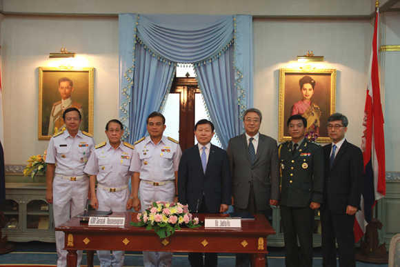 <사진> 7일 오후(현지시간) 태국 방콕 현지에서 고재호 대우조선해양 사장 (왼쪽 네번째), 수라삭 루언루엄롬 태국 해군참모총장 (세번째), 전재만 駐태국 한국대사 (다섯 번째), 駐태국 국방무관 성우영 대령 (여섯 번째) 등 양측 관계자들이 계약식 후 기념 촬영을 하고 있다.