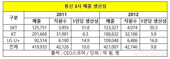 KT는 매출이 18조8천억 원으로 SK텔레콤보다 6조 이상 많았지만, 직원수가 3만2천여 명에 달해 1인당 생산성은 가장 낮았다. 수익성이 낮은 유선전화 분야에 종사하는 인력이 많고, KT의 특성상 고용이 유연하지 못한 게 원인이다.