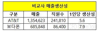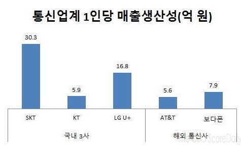 미국의 최대 통신사인 AT&T의 지난해 직원 1인당 생산성은 5억6천만 원에 불과하고, 영국의 최대 통신사인 보다폰도 7억9천만 원에 그쳤다.