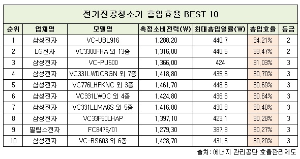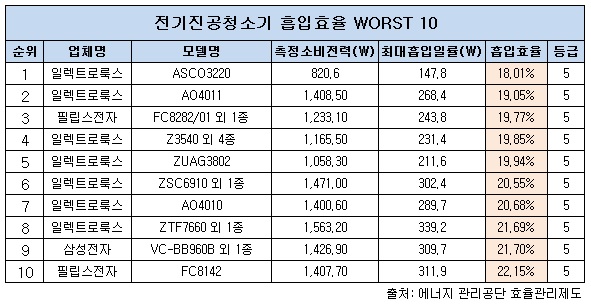 국내 제품중에선 삼성전자의 'VC-BB960B 외 1종'이 흡입효율 21.7%를 기록해 하위 10개 제품군 중 유일하게 9위를 기록한 것을 제외한다면 수입 제품 일색이다. 에너지 소비효율 등급 역시 예상대로 전 제품 모두 5등급을 기록했다.