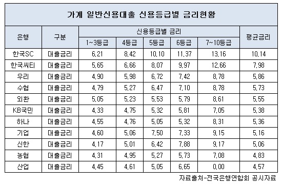 한국SC은행의 평균 신용대출금리가 연 10.14%로 시중은행 중 가장 높았다. 이 은행의 신용등급별 대출금리는 1~3등급 6.21%, 4등급 8.42%, 5등급 10.10%, 6등급 11.37%, 7~10등급 13.6%로 모든 등급에서 다른 은행에 비해 높았다.