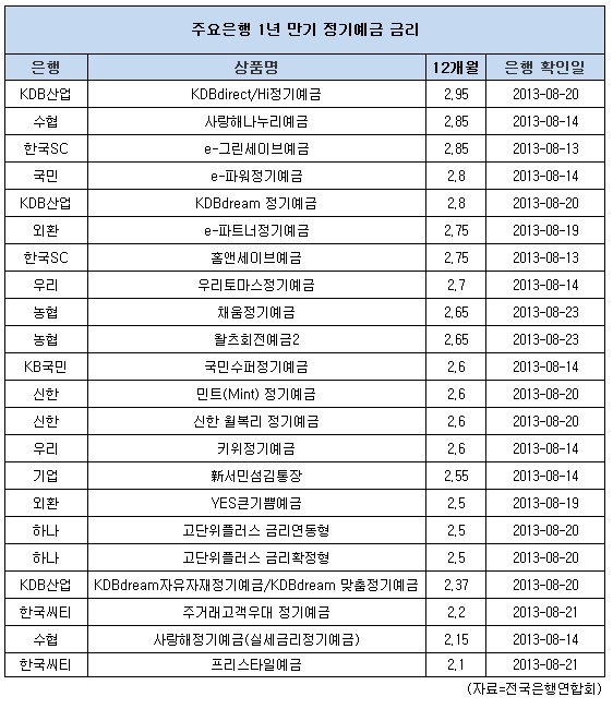 수협의 ‘사랑해정기예금’(2.15%), 씨티은행의 ‘주거래고객우대 정기예금’(2.2%), KDB산업은행의 ‘KDBdream자유자재정기예금/KDBdream 맞춤정기예금’(2.37%)도 금리가 낮은 편에 속했다.