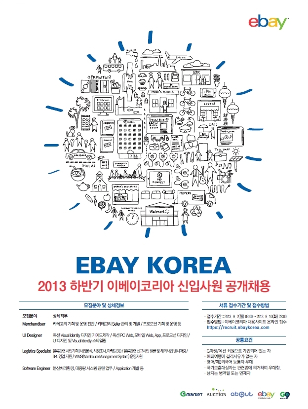오픈마켓 옥션-G마켓을 운영하고 있는 이베이코리아가 2013년 하반기 신입사원을 공개 채용한다.