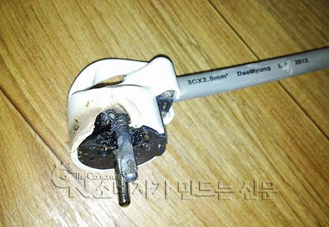 지난 달 23일 새벽 1시쯤 늦은 귀가를 한 김 씨는 거실쪽에서 타는 냄새가 나는 것 같아 급히 달려가보니 눈 앞에 믿기 힘든 광경이 펼쳐지고 있었다. 에어컨 전원코드에서 매캐한 연기와 함께 불꽃이 튀고 있었던 것.