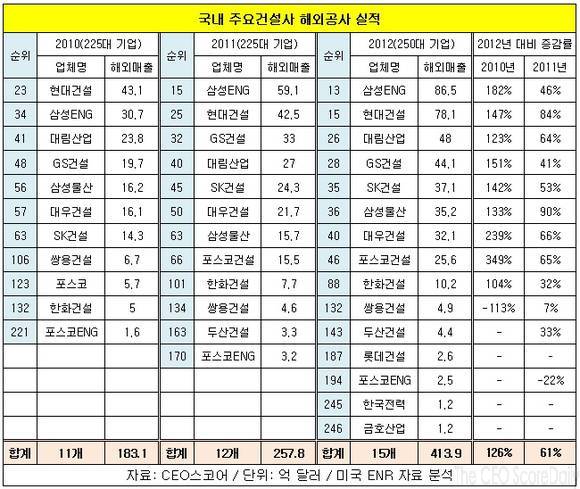 이 밖에 워크아웃 중인 해외건설 명가 쌍용건설(대표 김석준)이 132위에 올랐고, 포스코엔지니어링(대표 김수관)은 194위를 기록했다.