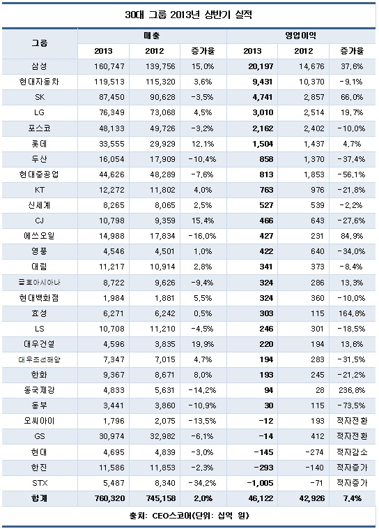 SK그룹(14개사)은 SK이노베이션(80.1%), SK종합화학(33%), SK텔레콤(5.4%) 등의 선전에 힘입어 영업이익이 66%증가했고, LG그룹(11개사)도 LG디스플레이(1750.5%), LG유플러스(312.2%) 등의 견조한 성장 덕분에 19.7%의 영업이익 증가세를 기록했다.